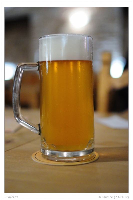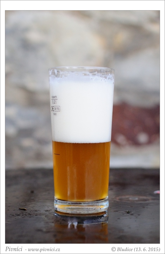 Zlatá barva, lehce zakalené, pěkná světlá pěna, slušně drží.Vůně (2,5 - lehce nadprůměr):
