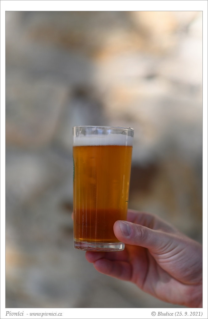 Zlatá barva, téměř čiré. Pěkná světlá pěna, dobře drží.Vůně (3 - dobré):