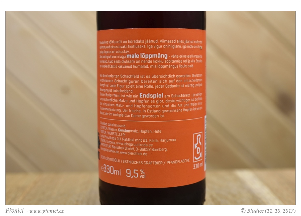 Chutné sladovější Barleywine. Velmi dobře se popíjí.Minimální trvanlivost: 24. listopadu 2019