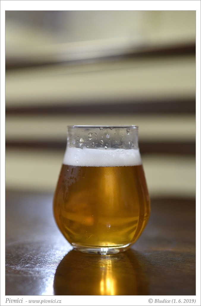 Tmavě zlatá barva, téměř čiré. Pěkná světlá pěna, dobře drží.Vůně (3 - dobré):