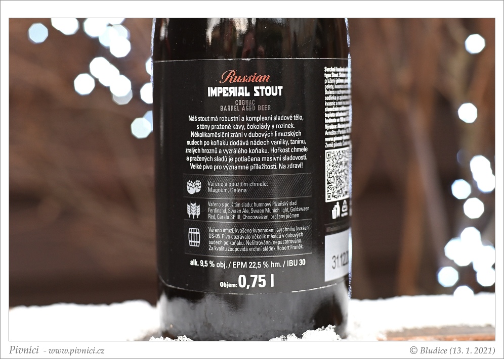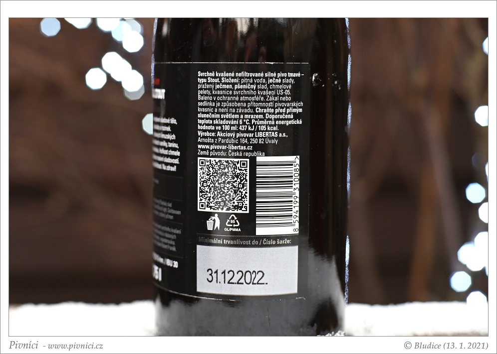 Barva téměř černá. Nižší spíše méně stabilní pěna s většími bublinami.Vůně (3 - dobré):
