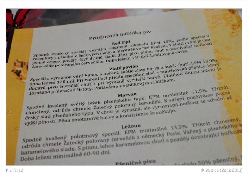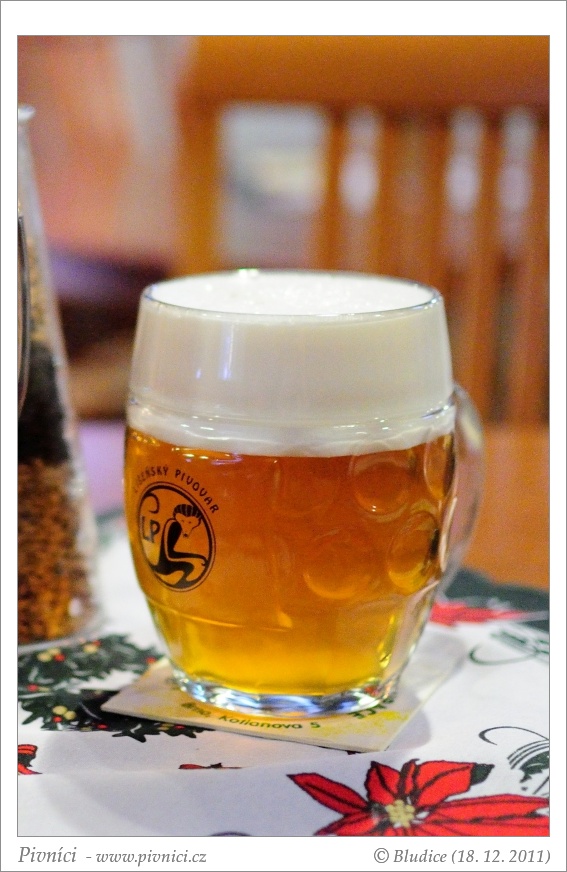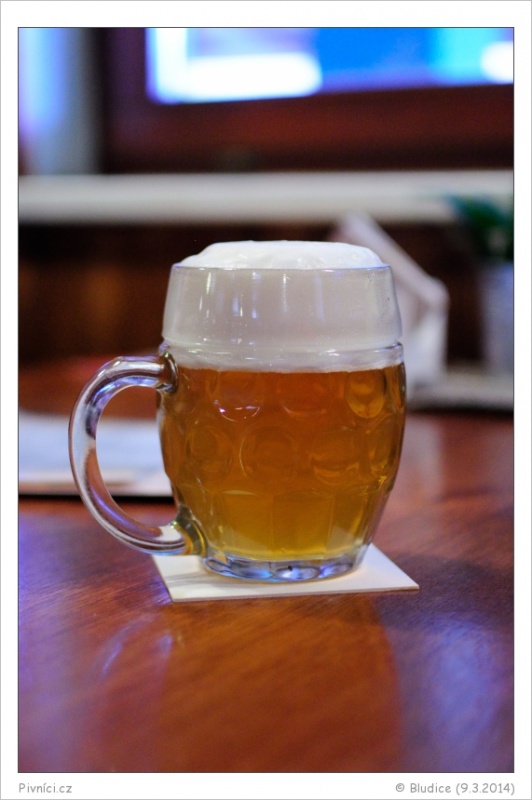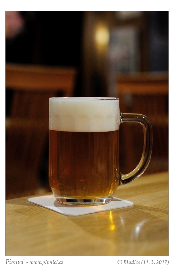 Zlatá barva, velmi lehce zakalené, slušná bílá pěna, dobře drží, lehce kroužkuje.Vůně (2,5 - lehce nadprůměr):