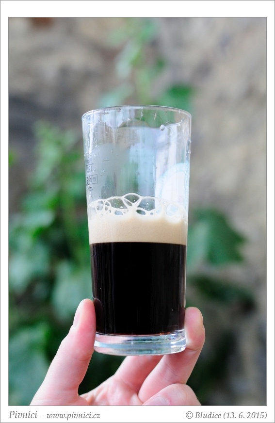 Ebenová barva, zdá se spíše čiré, pěkná světle béžová pěna, dobře drží.Vůně (2,5 - lehce nadprůměr):