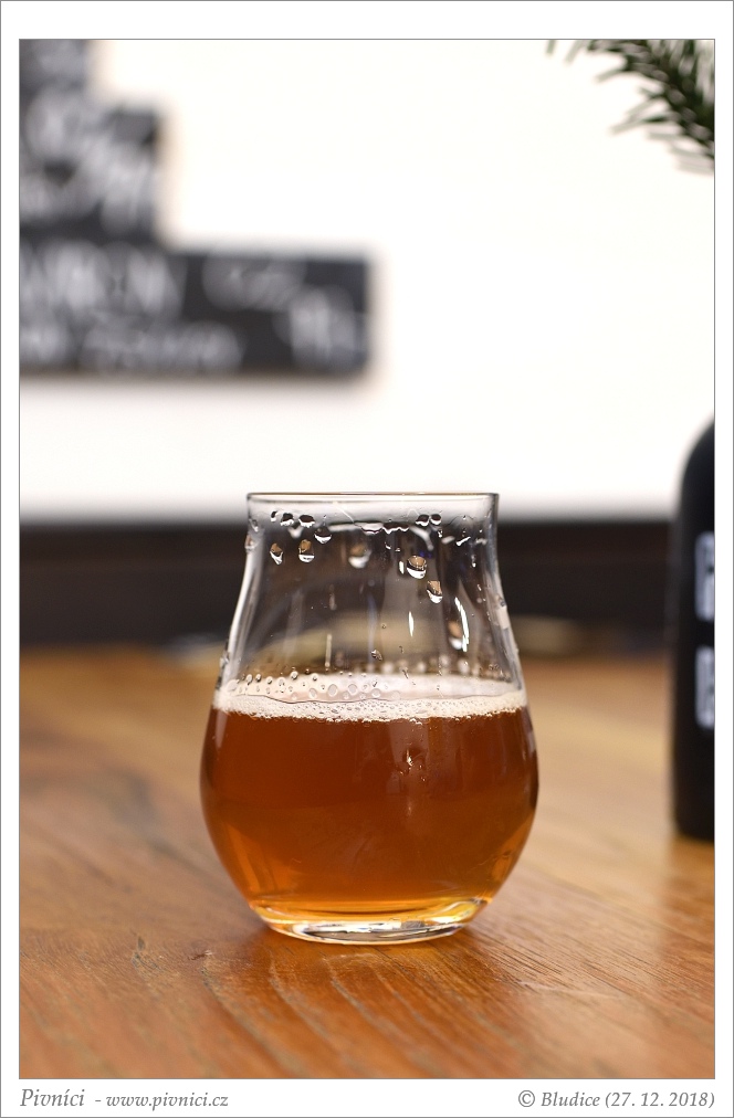 Měděná barva, téměř čiré. Nízká světlá pěna, dobře drží.Vůně (4 - výborné):