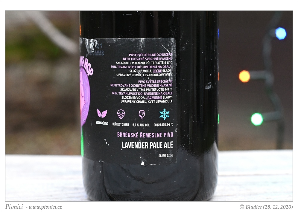 Měděná barva, čiré. Pěkná světlá pěna, dobře drží, slušně kroužkuje.Vůně (3 - dobré):