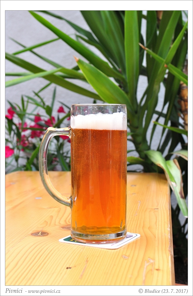 Zlatá barva, téměř čiré, pěkná světlá pěna, dobře drží.Vůně (2,5 - lehce nadprůměr):