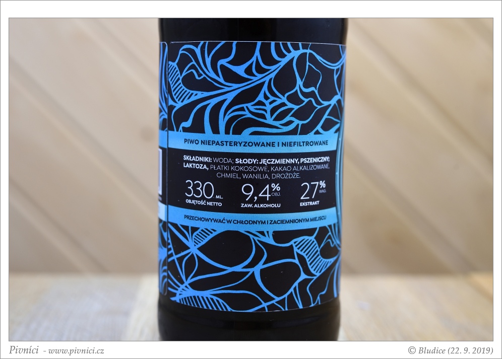 Barva téměř černá. S plovoucími kousky kokosu. Málo stabilní pěna.Vůně (3 - dobré):