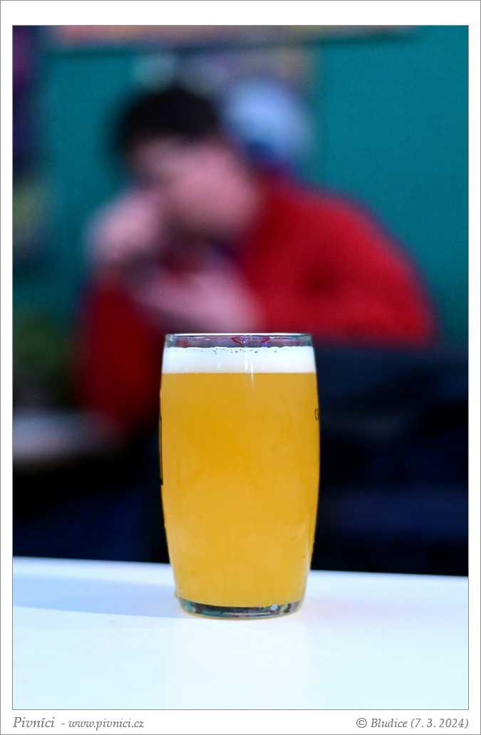 Zlatá barva, velmi zakalené. Slušná světlá pěna, moc nedrží.Vůně (3,5 - velmi dobré):