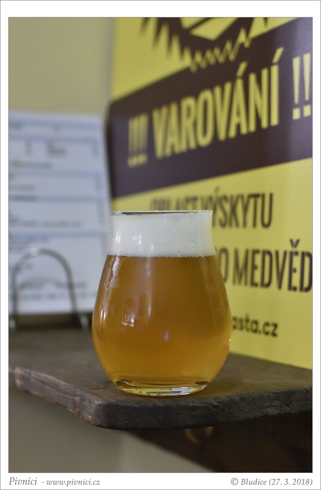 Zlatá barva, čiré. Pěkná světlá pěna, dobře drží.Vůně (2,5 - lehce nadprůměr):