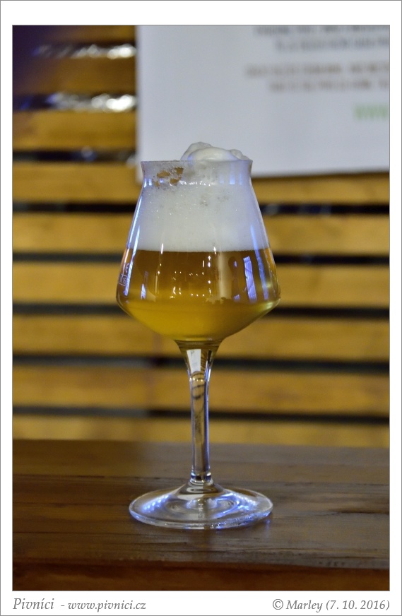 Zlatá barva, čiré. Pěkná světlá pěna, dobře drží.Vůně (3,5 - velmi dobré):