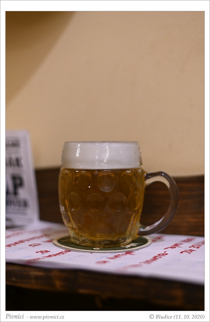 Zlatá barva, velmi lehce zakalené. Pěkná světlá pěna, dobře drží.Vůně (3,5 - velmi dobré):