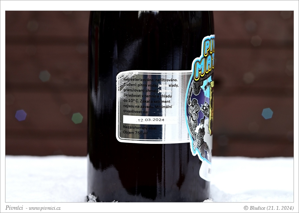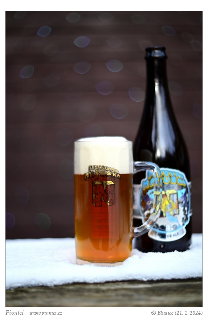 Tmavší zlatá barva, téměř čiré. Pěkná světlá pěna, dobře drží.Vůně (3,5 - velmi dobré):