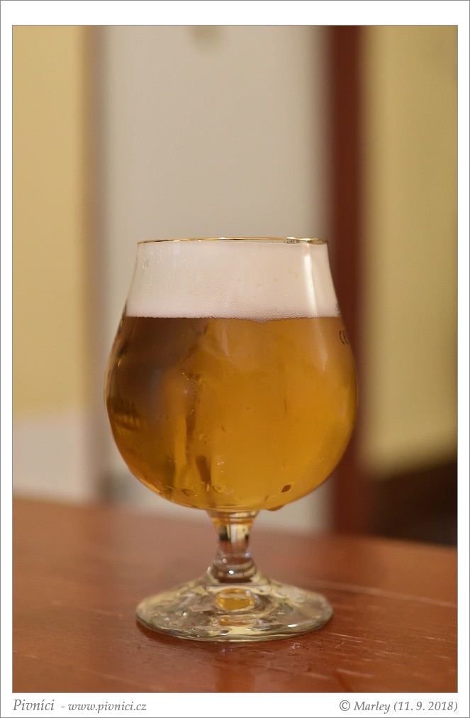 Zlatá barva, čiré. Pěkná světlá pěna, dobře drží.Vůně (3,5 - velmi dobré):