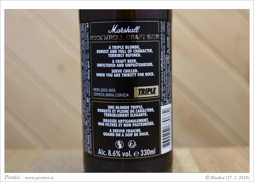 Tmavší zlatá barva, prakticky čiré. Slušná světlá pěna, celkem drží.Vůně (2,5 - lehce nadprůměr):