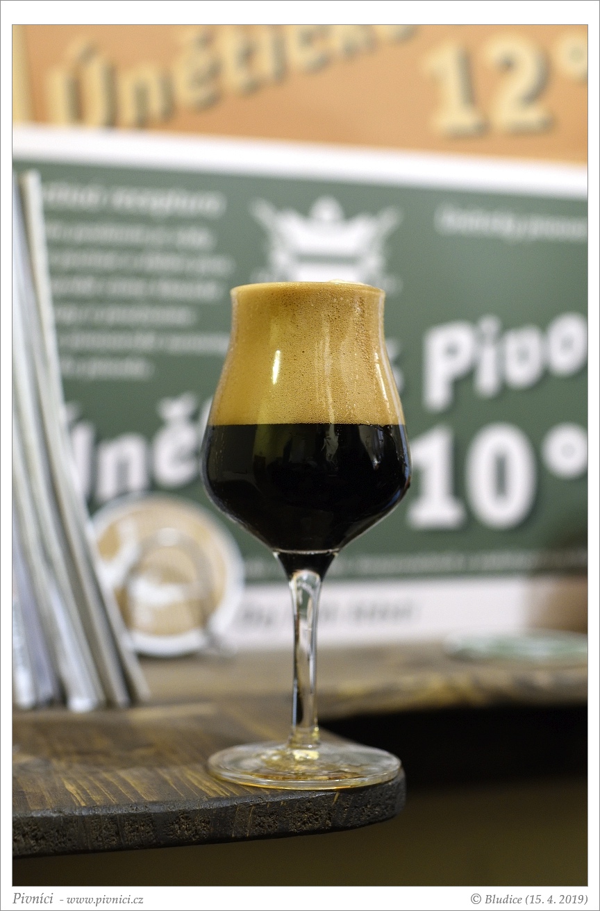 Barva téměř černá. Vyšší pěkná hustá stabilní pěna béžové barvy.Vůně (3 - dobré):