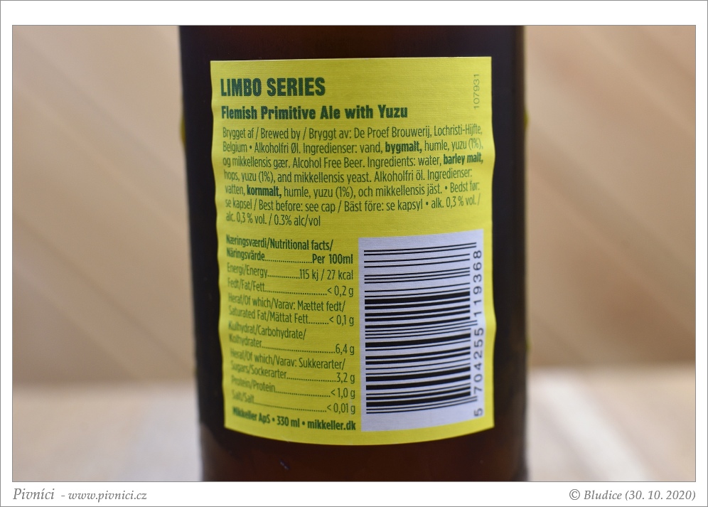 Složení podrobně: 1 % yuzu, vlastní kvasnice "Mikkellensis" produkující malé množství alkoholu a tóny tropického ovoce