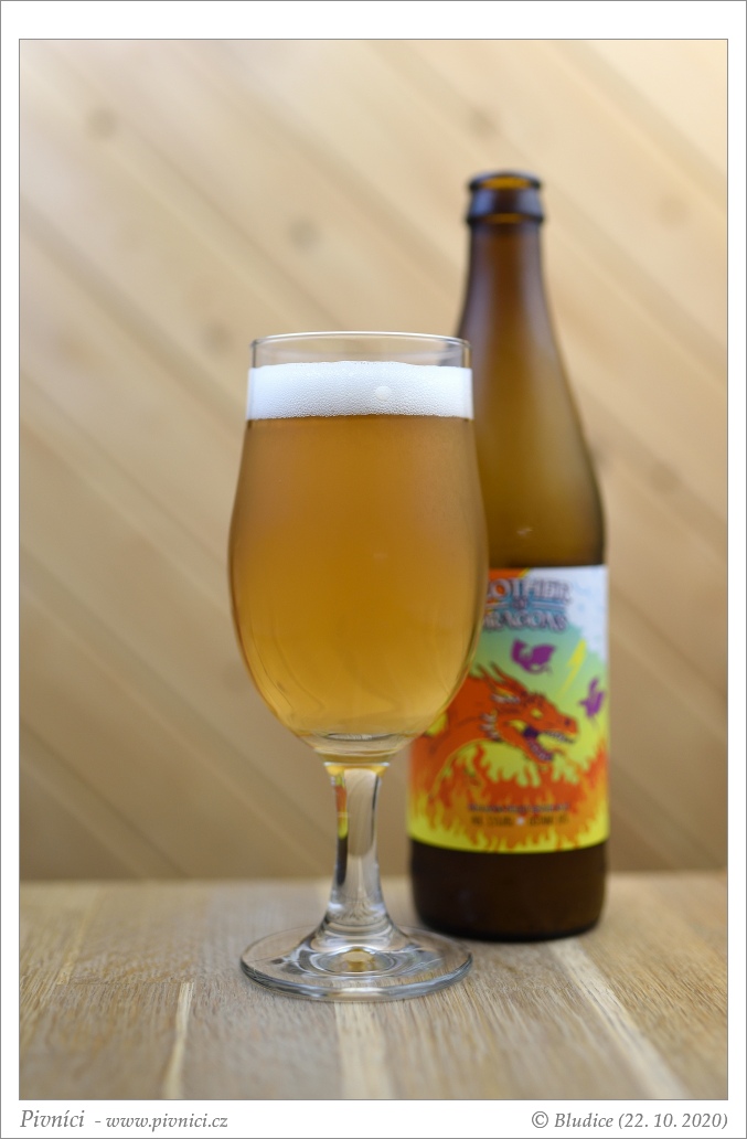 Světle zlatá barva, prakticky čiré. Nižší světlá pěna, moc nedrží.Vůně (3 - dobré):