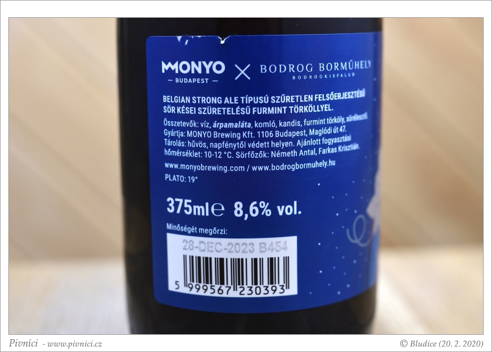 Zajímavé pivo s výraznými tóny tokajského vína, velmi dobře se popíjí.Minimální trvanlivost: 28. prosince 2023