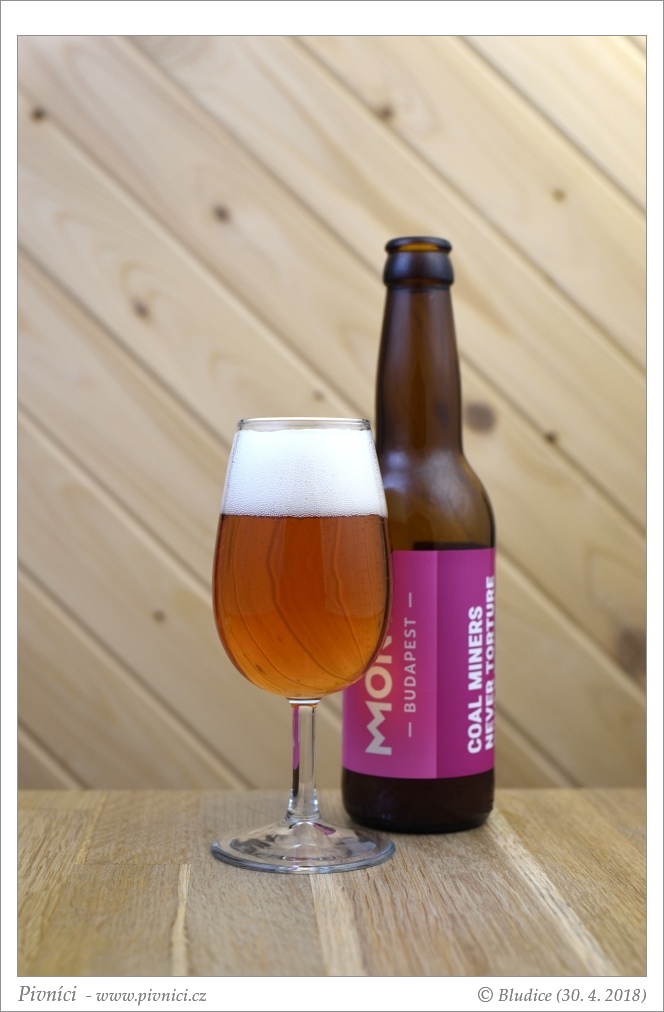 Tmavší zlatá až oranžová barva, prakticky čiré. Vysoká světlá pěna s náznakem růžových tónů, velmi dobře drží.Vůně (4 - výborné):