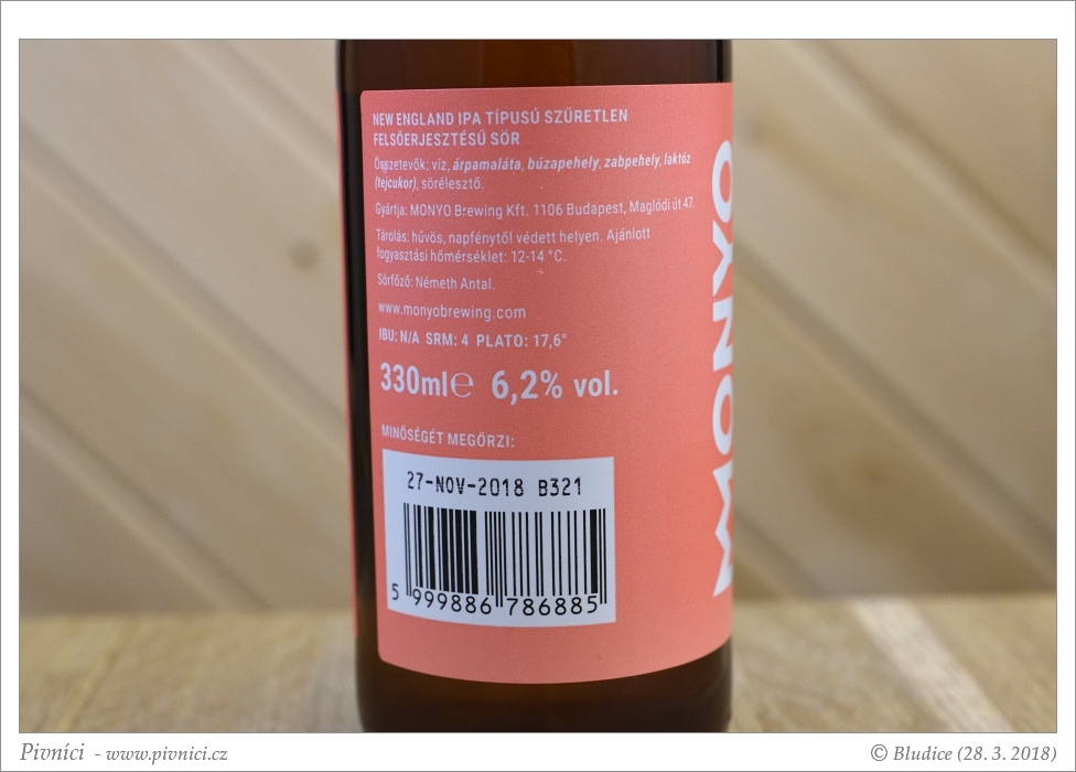 Fajn sladovější IPA, výrazně ovocná, dobře pitelná.Minimální trvanlivost: 27. listopadu 2018