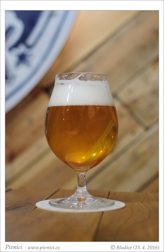 Zlatá barva, velmi lehce zakalené, pěkná světlá pěna, celkem drží.Vůně (3,5 - velmi dobré):
