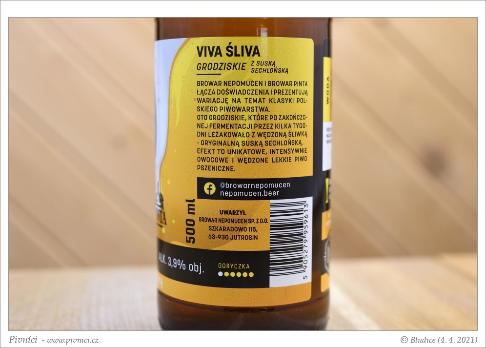 Světle zlatá barva, středně zakalené. Pěkná světlá pěna, dobře drží.Vůně (4 - výborné):