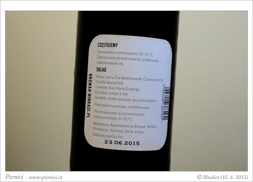 Ebenová barva, asi lehce zakalené (možná z ovsa, týden odpočívalo v lednici), pěkná béžová pěna, ale příliš nedrží.Vůně (2 - průměr):