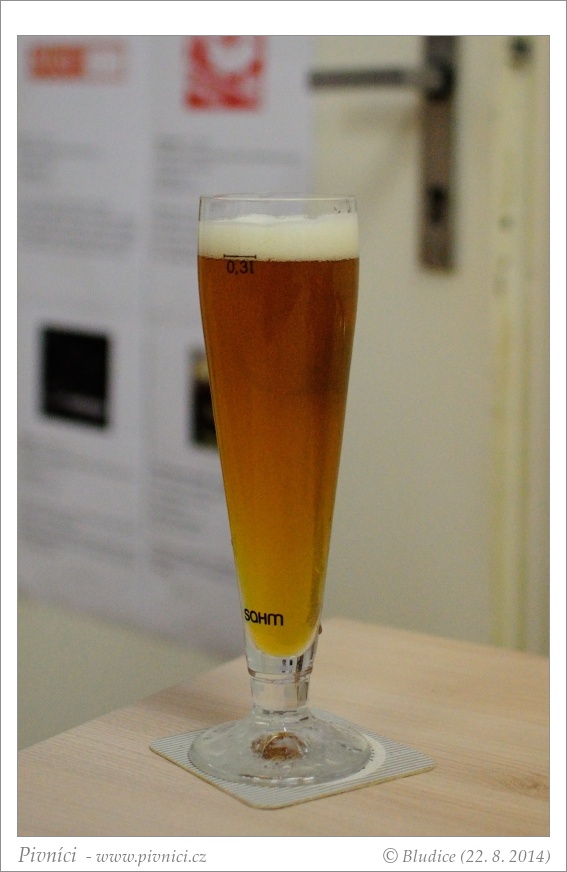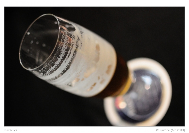 Zlatá barva, lehce zakalené, slušná světlá pěna, průměrně drží.Vůně (1,5 - nedobré):