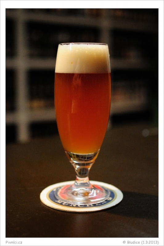 Jantarová barva, více zakalené, průměrná bílá pěna.Vůně (3,5 - velmi dobré):