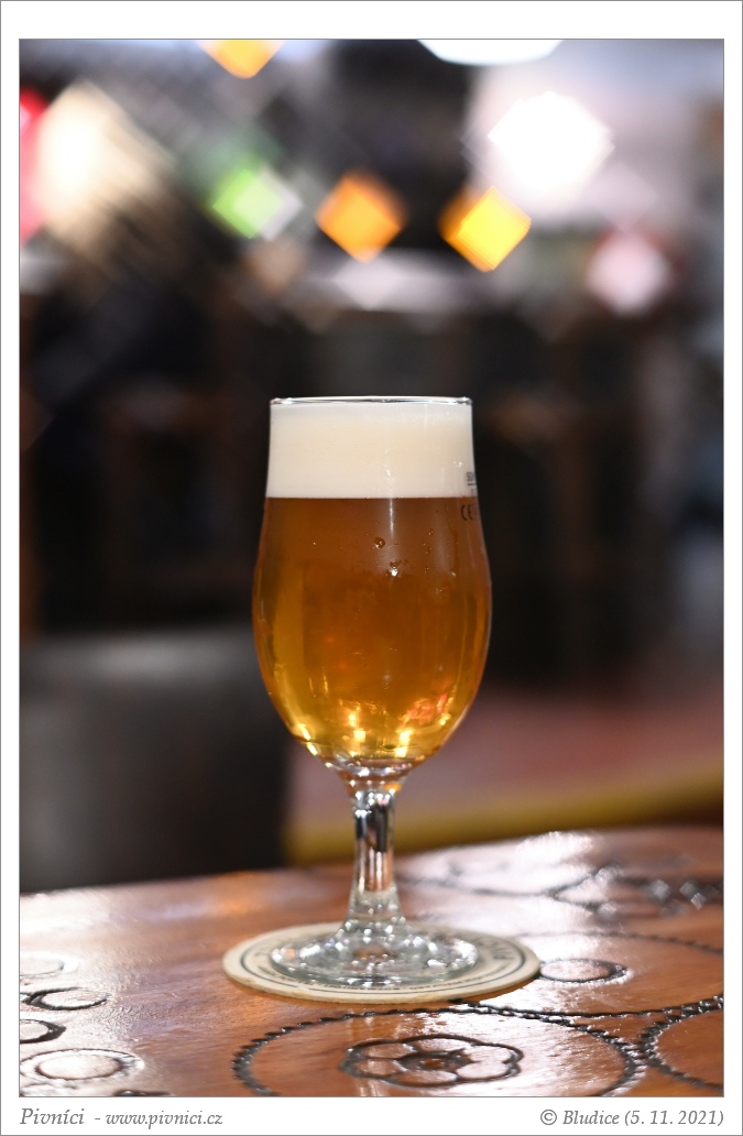 Tmavě zlatá barva, lehce zakalené. Pěkná světlá pěna, dobře drží, hezky kroužkuje.Vůně (3 - dobré):