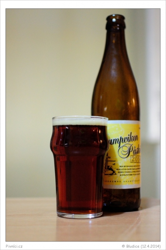 Tmavě měděná až mahagonová barva, čiré, slušná světle okrová pěna, celkem drží.Vůně (4 - výborné):