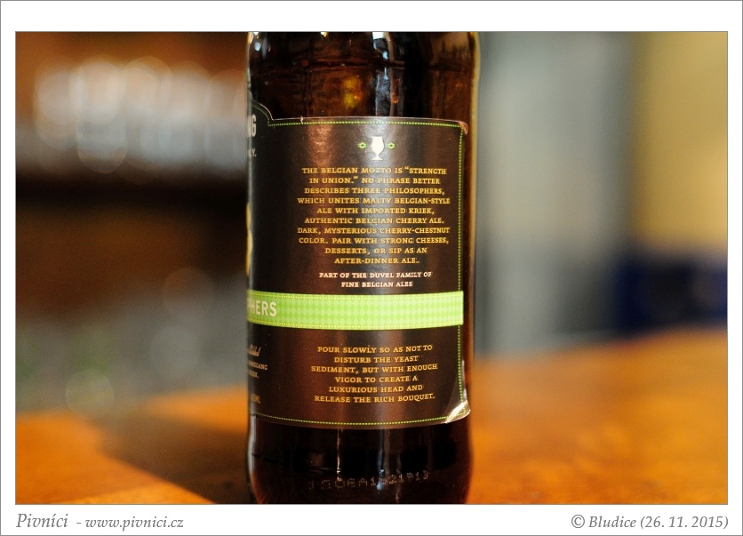 Mahagonová barva, téměř čiré, pěkná světlá pěna, slušně drží.Vůně (4,5 - úchvatné):
