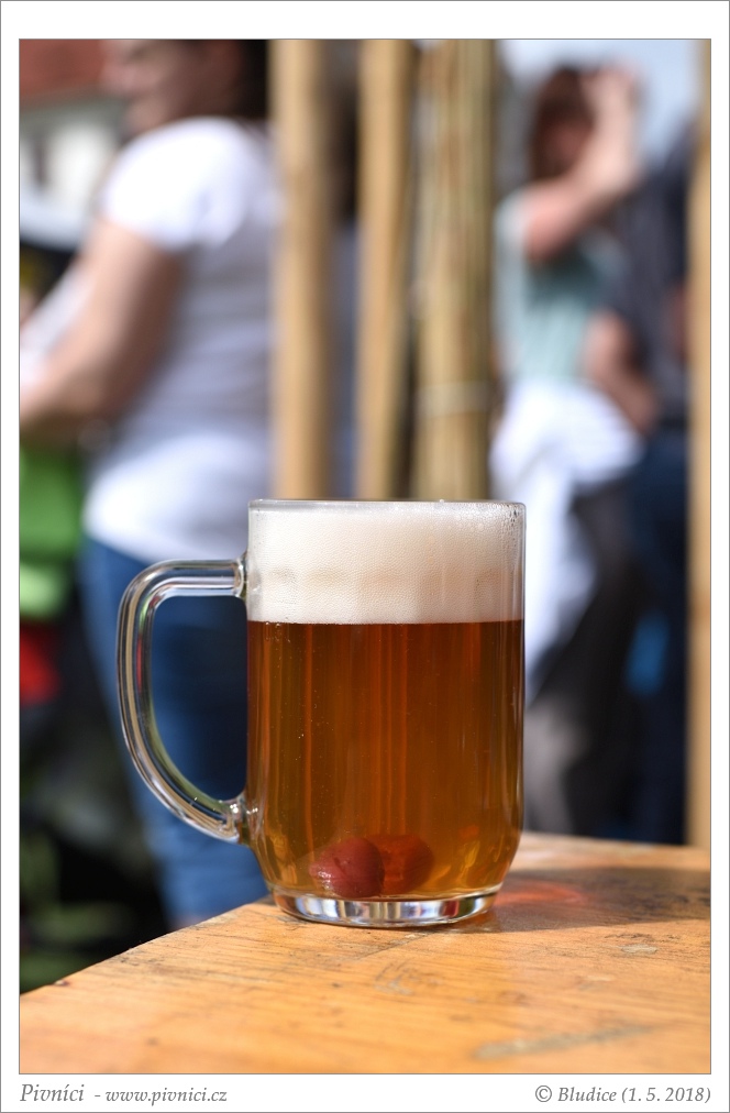 Zlatá barva, téměř čiré, s dvěma plovoucími třešněmi. Pěkná světlá pěna, dobře drží.Vůně (2 - průměr):