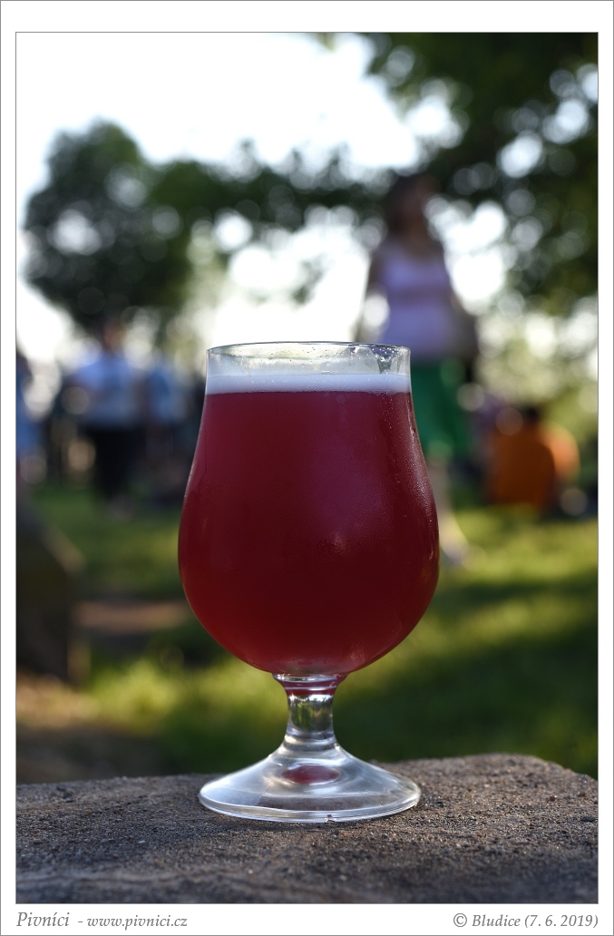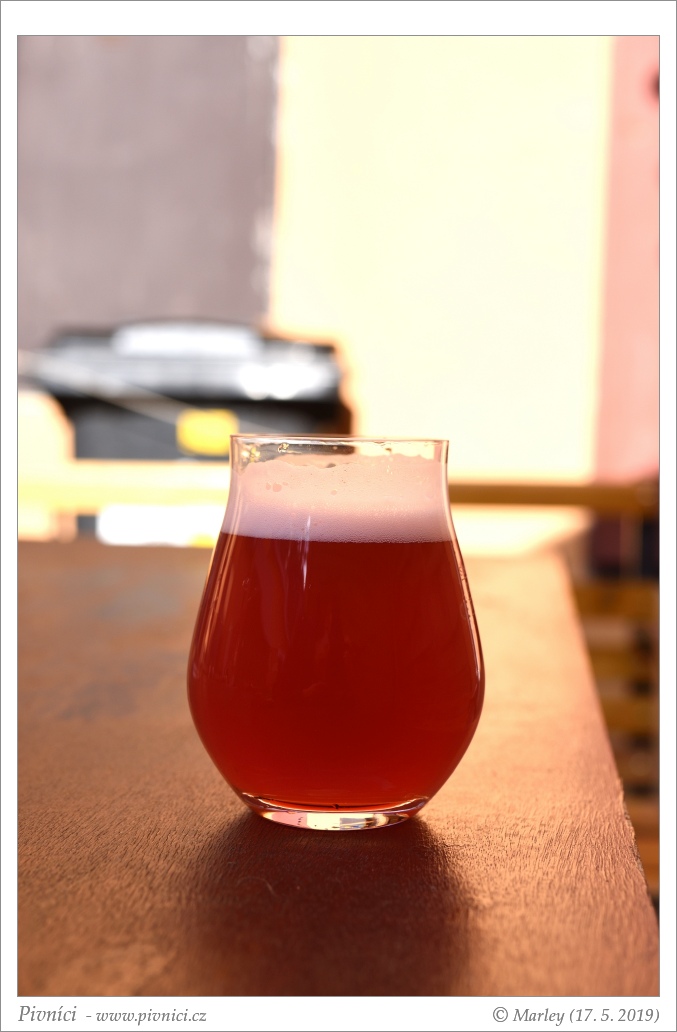 Tmavě růžová barva, více zakalené. Pěkná světlá pěna s růžovým nádechem, slušně drží.Vůně (3 - dobré):