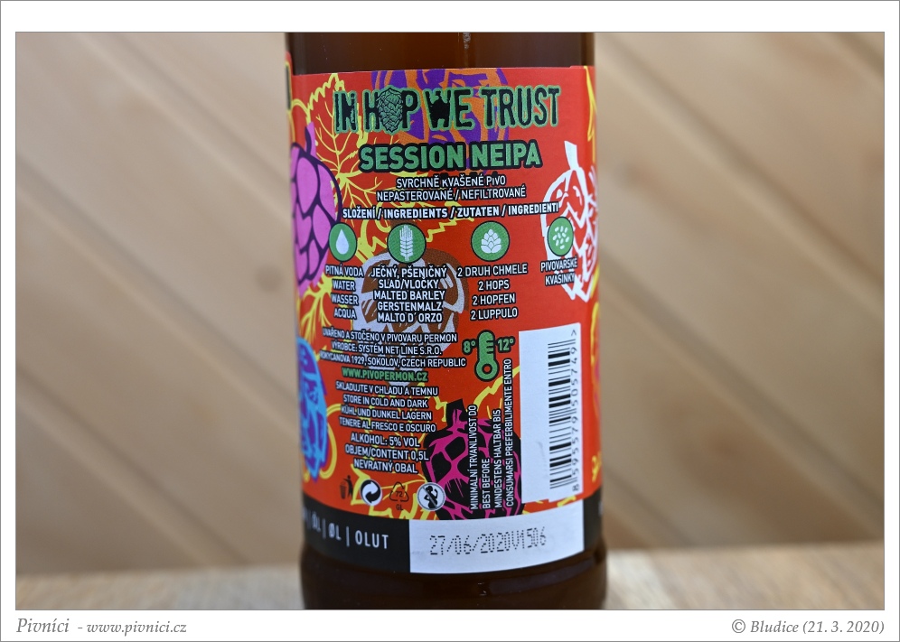 Vcelku dobře pitelná New England IPA, po delší dobře ucházející lahvové pivo od Permona.Minimální trvanlivost: 27. června 2020