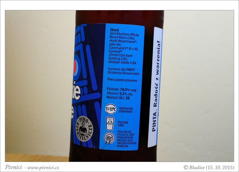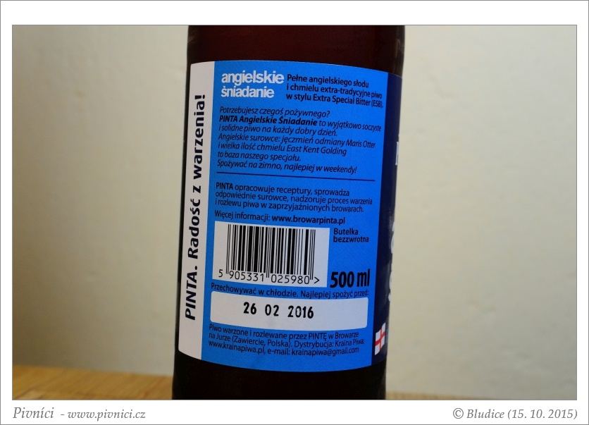 Chutné pivo, s trochu neanglicky vyšším řízem. Ale pije se celkem dobře.Minimální trvanlivost: 26. února 2016