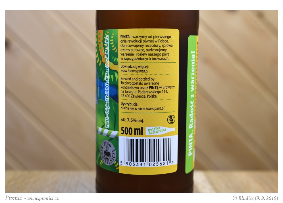 Světle zlatá barva, lehce zakalené (trvalo skoro dva měsíce než se v klidu lednice trochu vyčeřilo). Nižší světlá pěna, celkem drží.Vůně (3 - dobré):