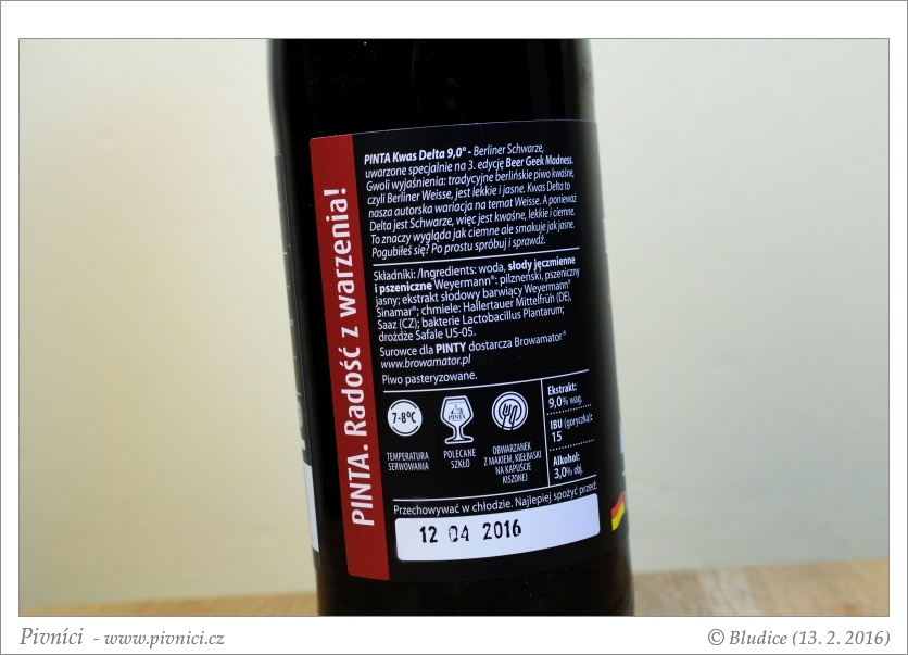 Lehký a svěží kyseláč, poněkud prázdnější, ale dobře pitelný.Minimální trvanlivost: 12. dubna 2016