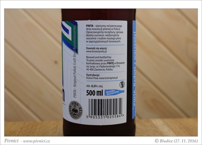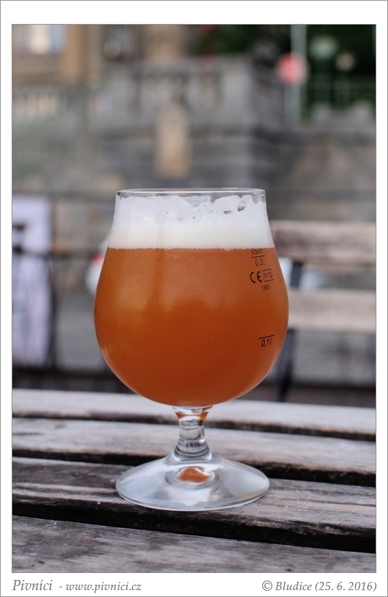 Tmavě zlatá barva, lehce zakalené (odpočívalo v klidu lednice několik měsíců), pěkná světlá pěna, slušně drží.Vůně (3,5 - velmi dobré):