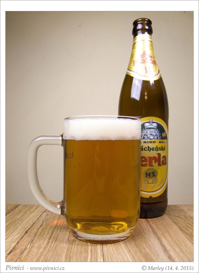 Zlatá barva, čiré, krémová bílá pěna.Vůně (2,5 - lehce nadprůměr):