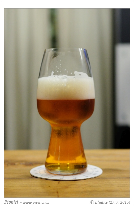 Tmavší zlatá barva, čiré, pěkná bílá pěna, dobře drží.Vůně (1,5 - nedobré):
