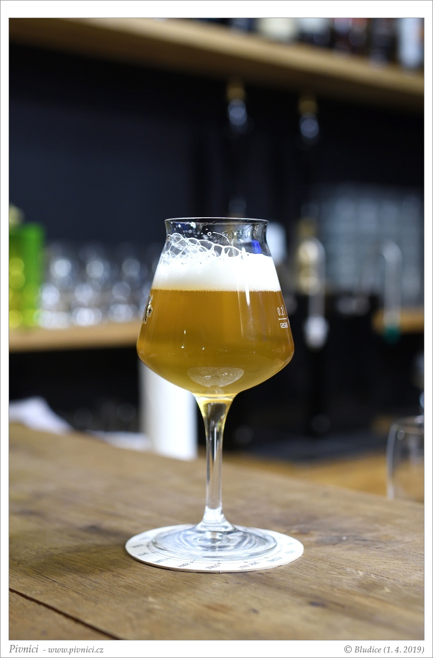 Zlatá barva, lehce zakalené. Pěkná světlá pěna, dobře drží.Vůně (3 - dobré):