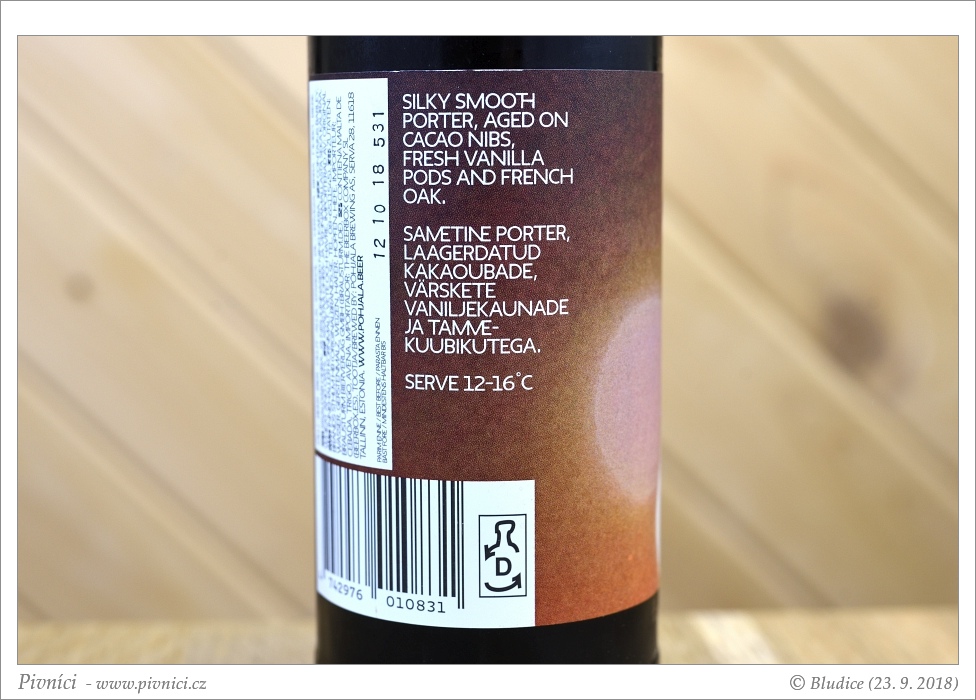 Chutný silný porter s dlouhým dozníváním. Výborně se popíjí.Minimální trvanlivost: 12. října 2018