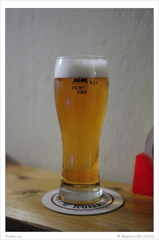 Zlatá barva, téměř čiré, slušná světlá pěna.Vůně (3 - dobré):