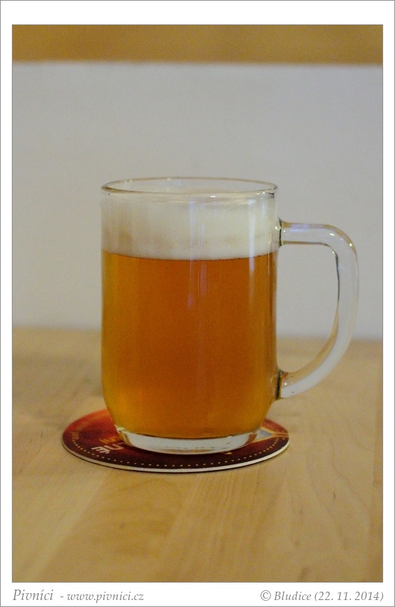 Tmavší zlatá barva, lehce zakalené, pěkná bílá pěna, dobře drží, náznak kroužkování.Vůně (3 - dobré):