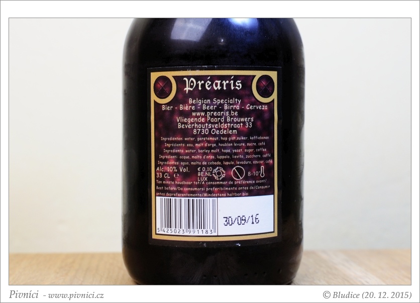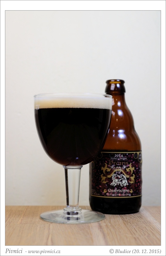 Barva tmavě mahagonová, téměř čiré. Pěkná hustá průměrně stabilní pěna velmi světle béžové barvy.Vůně (3 - dobré):