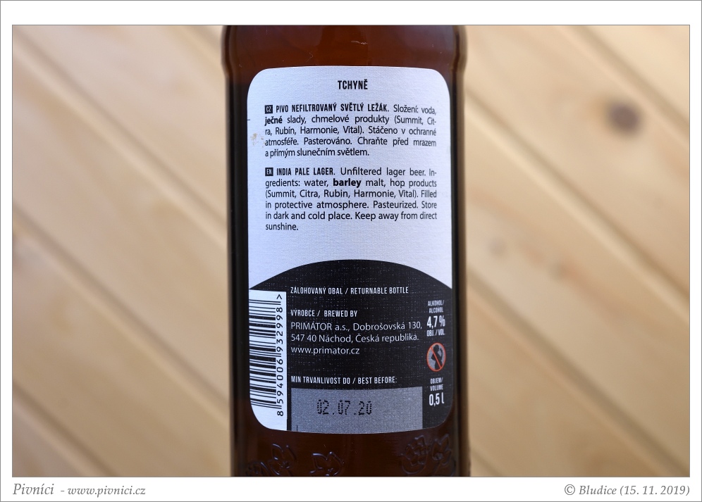 Zlatá barva, téměř čiré. Pěkná světlá pěna, velmi dobře drží.Vůně (2,5 - lehce nadprůměr):