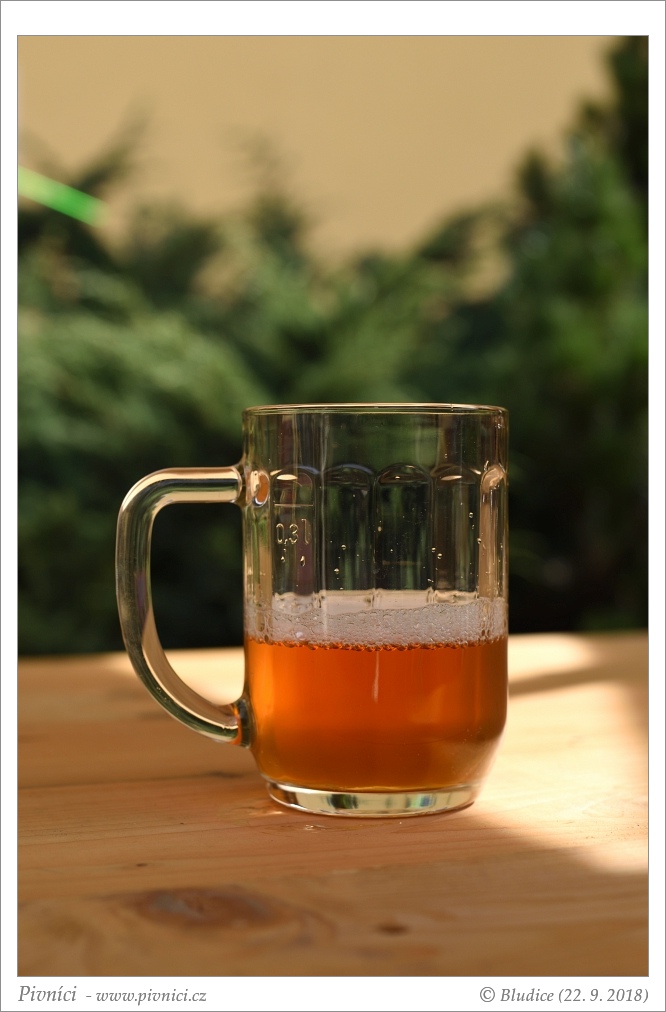 Zlatá barva, lehce zakalené. Nízká světlá pěna, brzy mizí (samospád).Vůně (2,5 - lehce nadprůměr):