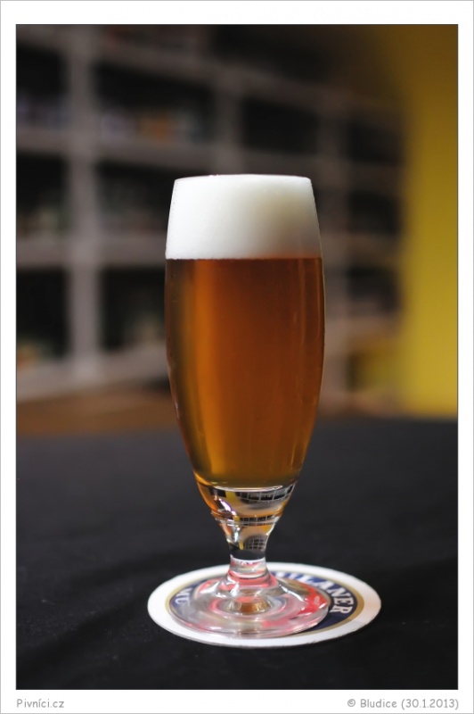 Zlatá barva, lehce zakalené, hezká bílá krémová pěna.Vůně (4 - výborné):