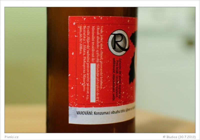 Zlatá barva, velmi lehce zakalené, slušná světlá pěna, lehce kroužkuje.Vůně (3 - dobré):